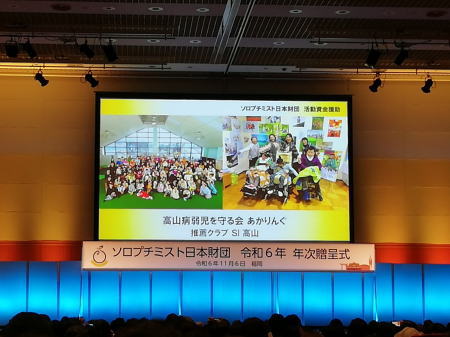 公益 ソロプチミスト日本財団、飛騨地域の重度心身障がい児の保護者らでつくる「高山病弱児を守る会あかりんぐ」に活動支援金として30万円を寄付 あかりんぐは、2015年に前身となる「岐阜病弱児を守る会飛騨支部」を引き継ぎ、「高山病弱児を守る会」として体制も名称も変更。