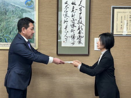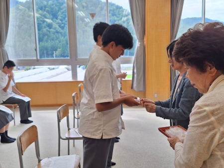 活動報告 :「であい塾」へ 高桑会長より見山教育委員長へ備品購入金として5万円を贈呈