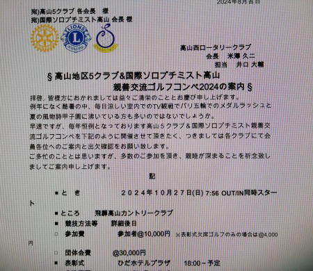 2024年度より、団体会費を国際ソロプチミスト高山で納めることが承諾され、SI高山会員5名が高山地区5クラブとの親善交流ゴルフコンペ2024に参加しました。