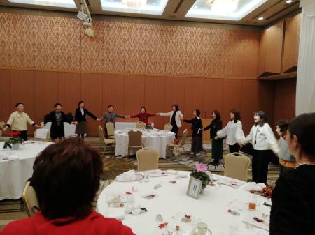 最後に全会員で手と手を心と心を結ぶ全会員の友情の輪でソロプチミストシンフォニ-を 歌い真摯なる友情を深めました。