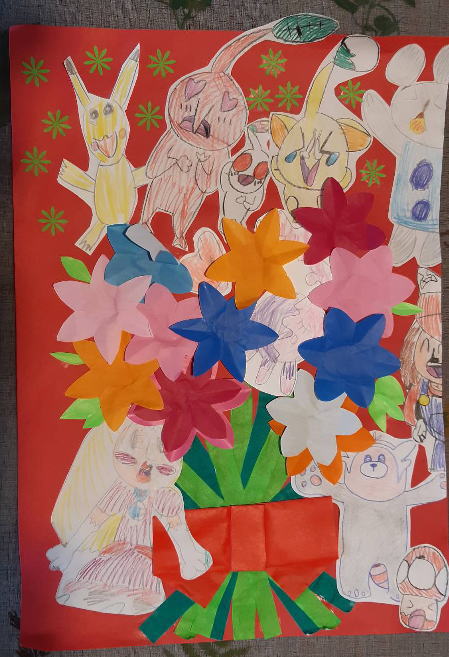 最後にSI高山の会員がサンタに扮して、恒例のお菓子の プレゼントをしたところ山ゆり学園の子どもたちから、SI高山会員私たちへ、みんなで描いた